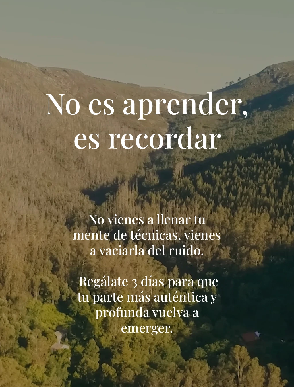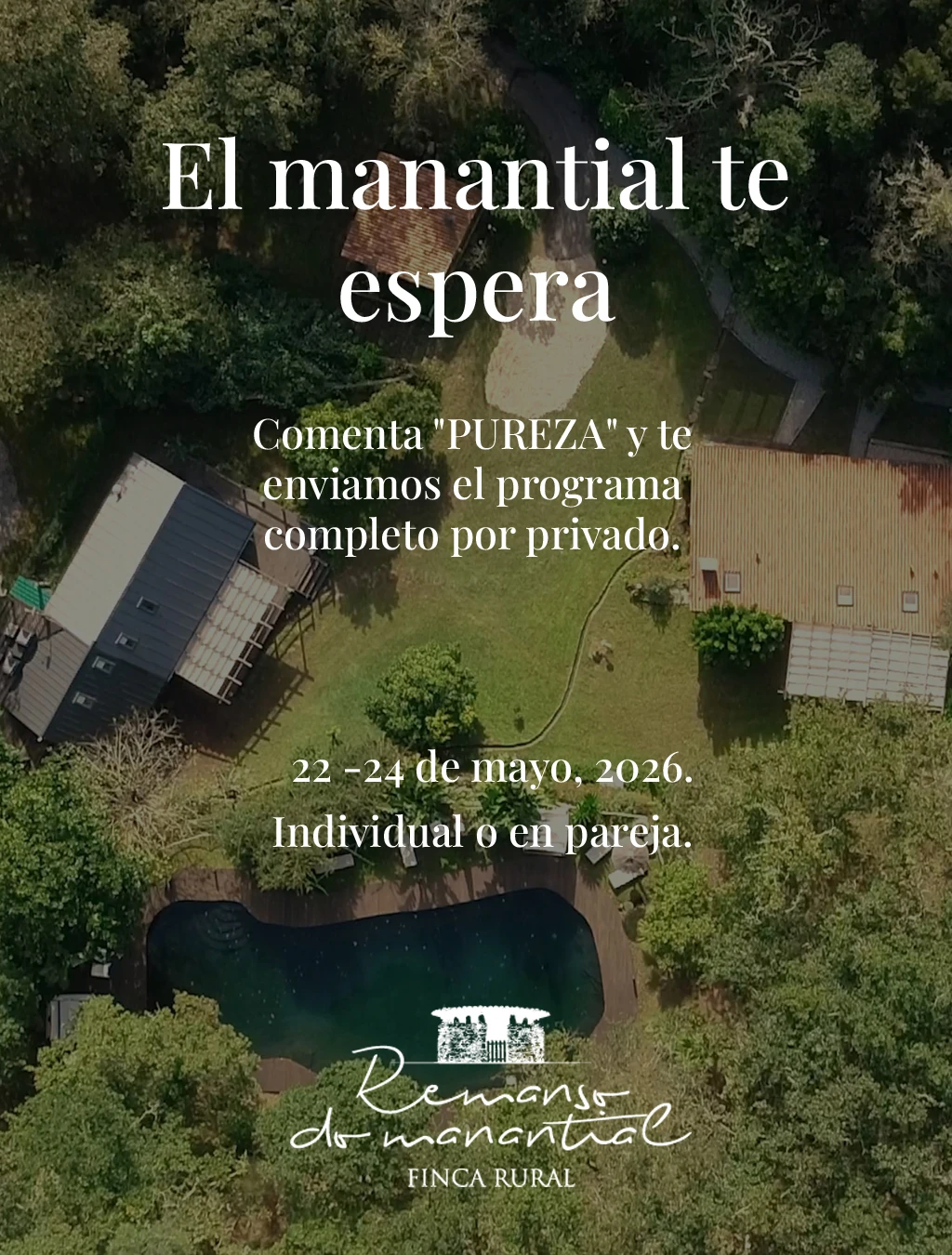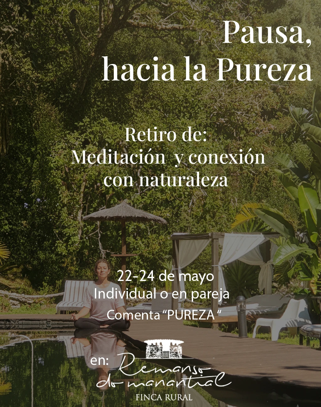 ¿Cuándo fue la última vez que te permitiste, simplemente, ser? A menudo buscamos fuera respuestas que solo aparecen cuando hacemos silencio. En Remanso do Manantial no te enseñamos nada nuevo; te acompañamos a que lo recuerdes. Pausa hacia la Pureza es más que un retiro de meditación. Es una pausa necesaria de 3 días para vaciar el ruido, soltar las cargas y permitir que tu parte más auténtica y profunda vuelva a emerger a la superficie. Acompañados por Carlos Romero y Vanessa, transitaremos un camino hacia la ecuanimidad y la unión real de cuerpo, mente y espíritu. Todo esto, abrazados por la magia de nuestra finca, donde el agua y el viento dictan el ritmo. ¿Sientes la llamada de la calma y de reconexión contigo? Cuándo: del 22 al 24 de mayo de 2026. Dónde: Finca Rural Remanso do Manantial, Puebla do Caramiñal (A Coruña). Nivel: abierto a todos. Sin juicios, a tu propio ritmo. Habitar el cuerpo. Calmar el ego. Mirar de frente a la mente.